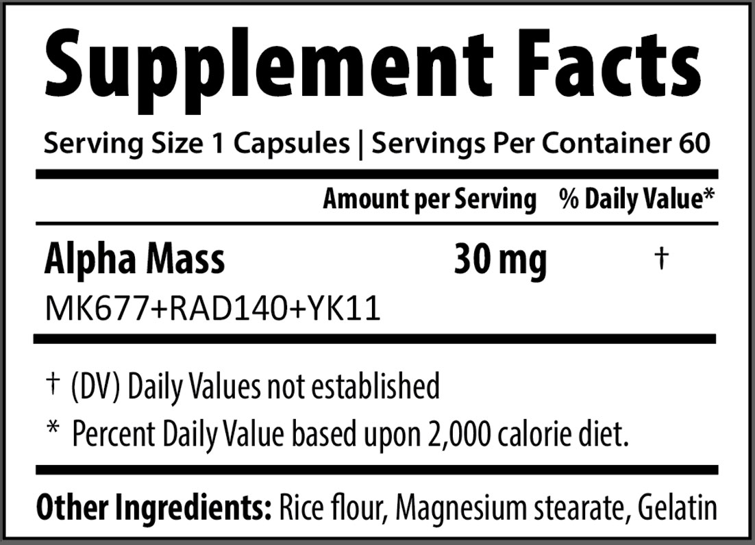 ALPHA MASS A blend of MK-677 (Ibutamoren), RAD-140 (Testolone), and YK-11 is often promoted in the performance community for its potential to enhance muscle growth, recovery, and strength. MK-677 is linked with stimulating growth hormone release and supporting better sleep and recovery, RAD-140 is known for its strong anabolic effects and lean muscle support, while YK-11 is suggested to boost muscle hypertrophy by modulating myostatin activity. Together, this stack is seen as a powerful option for those aiming to maximize size, strength, and overall performance.