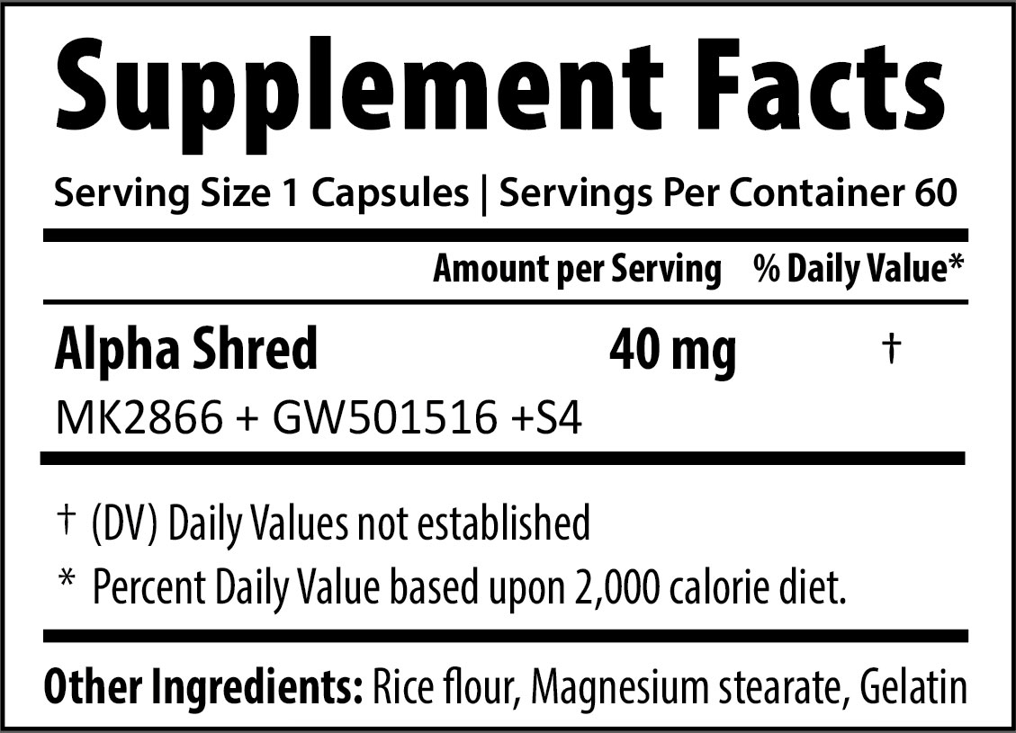 Alpha Shred a blend of MK-2866 (Ostarine), GW-501516 (Cardarine), and S4 (Andarine) is often promoted in the fitness community for its potential to support muscle preservation, enhance endurance, and improve overall performance. MK-2866 is known for aiding lean muscle retention, GW-501516 is associated with increased stamina and fat metabolism, while S4 may contribute to strength and vascularity. When combined, this stack is suggested to offer a synergistic effect for individuals seeking improved body composition and workout intensity.